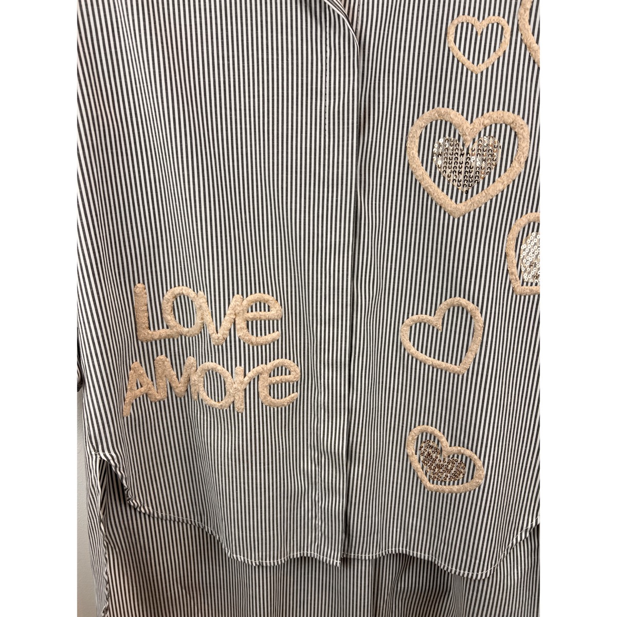 Optez pour une allure chic et décontractée avec cette chemise liquette en coton rayé gris, parfaite pour un look féminin et tendance. Ses délicats motifs cœurs sur le devant apportent une touche douce et romantique tout en restant modernes.
