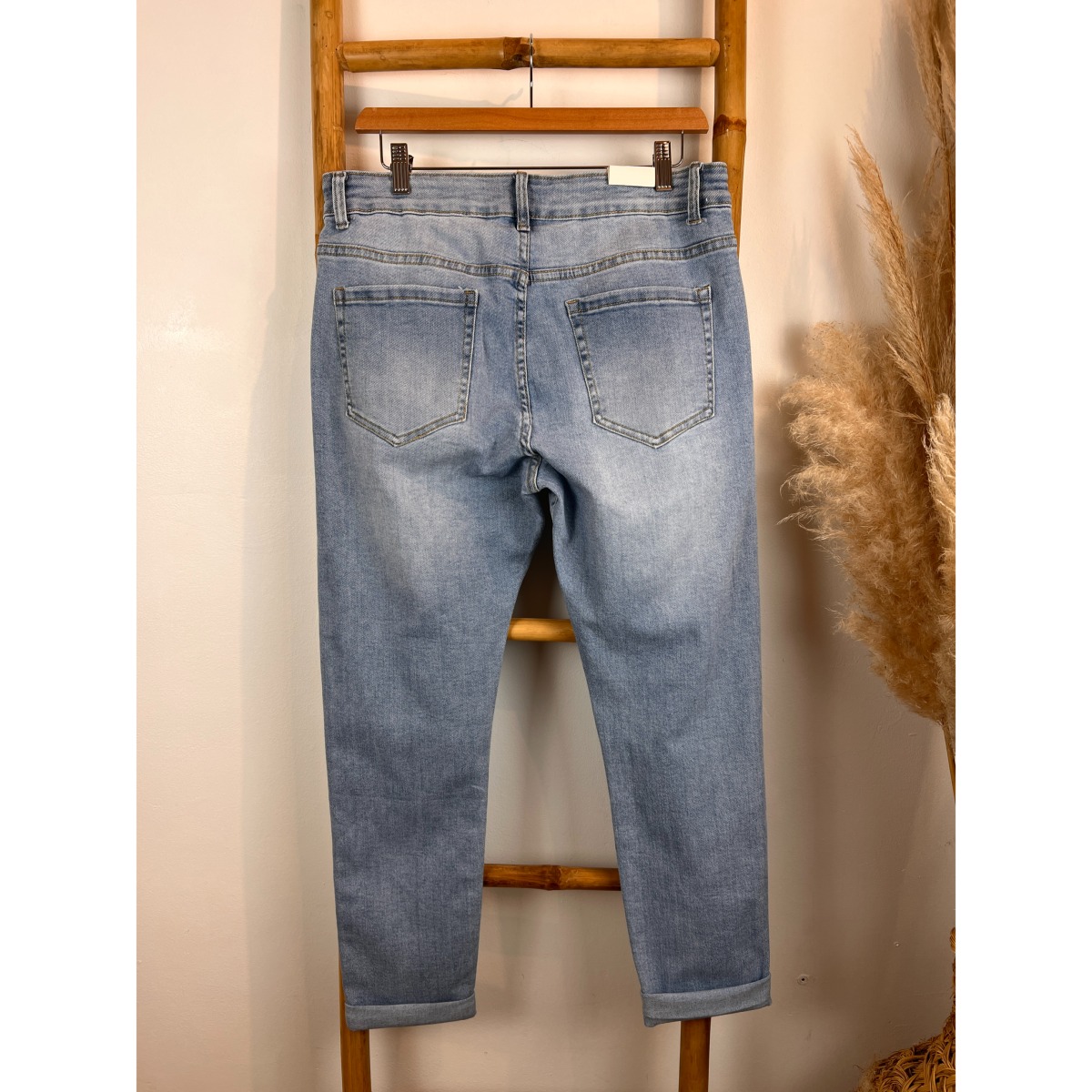 Les effets déchirés apportent une touche casual et moderne, tandis que les strass subtils illuminent la silhouette avec élégance, sans en faire trop. Idéal pour créer un look chic et décontracté, ce jean grande taille se porte aussi bien avec des baskets et un t-shirt qu’avec des talons et une blouse fluide.