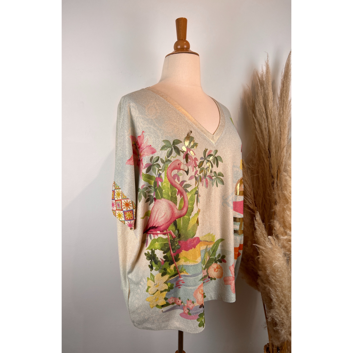 Apportez une touche d’originalité et de lumière à votre tenue avec ce pull grande taille en lurex aux couleurs douces avec son imprimé flamants roses qui apporte une note exotique et tendance, tandis que les fils de lurex subtilement intégrés illuminent le tissu pour un effet légèrement scintillant et féminin.
