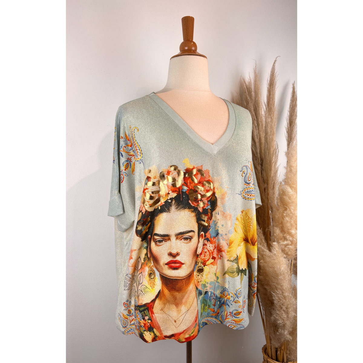Ce modèle se distingue par son illustration inspirée de Frida dans un esprit printanier, mise en valeur par une somptueuse fleur d’hibiscus jaune. Les détails lumineux du lurex apportent une subtile brillance qui capte la lumière, pour un rendu à la fois chic et original.