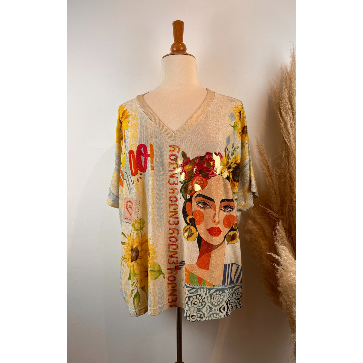 Son design unique met en scène un visage délicat façon poupée russe, inspiré de l’univers artistique de Frida, entouré de couleurs éclatantes et de magnifiques tournesols baignés de soleil. Ce visuel vibrant apporte une touche artistique et chaleureuse à votre tenue, parfaite pour affirmer votre style avec originalité.
