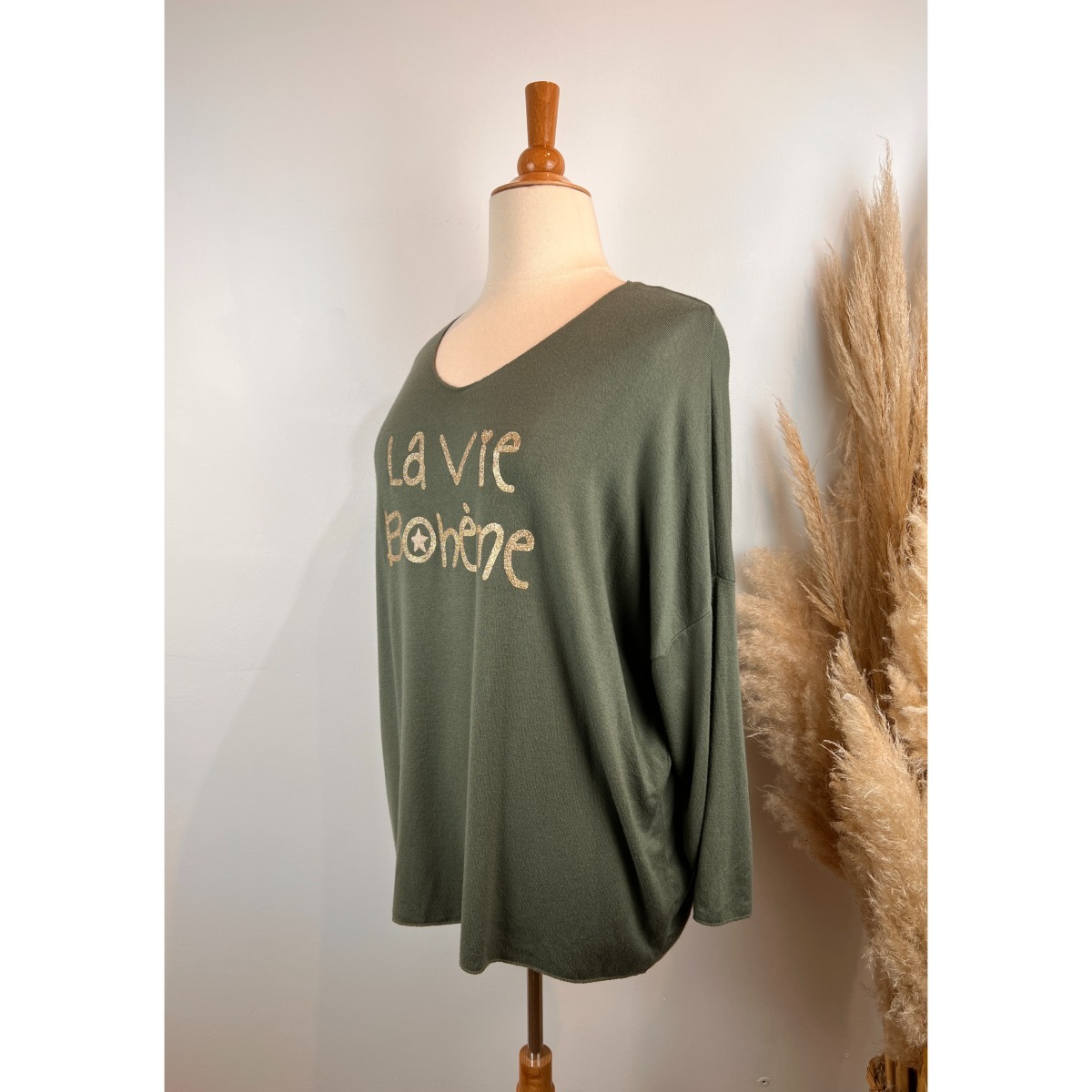 Apportez une touche de douceur et d’élégance à votre dressing avec ce pull grande taille de la nouvelle collection, idéal pour la saison printanière. Confectionné dans une matière ultra douce, il offre un confort absolu tout au long de la journée. Son design tendance est sublimé par l’inscription « La Vie Bohème » sur le devant, rehaussée de pailletés dorés pour une note lumineuse et féminine.
