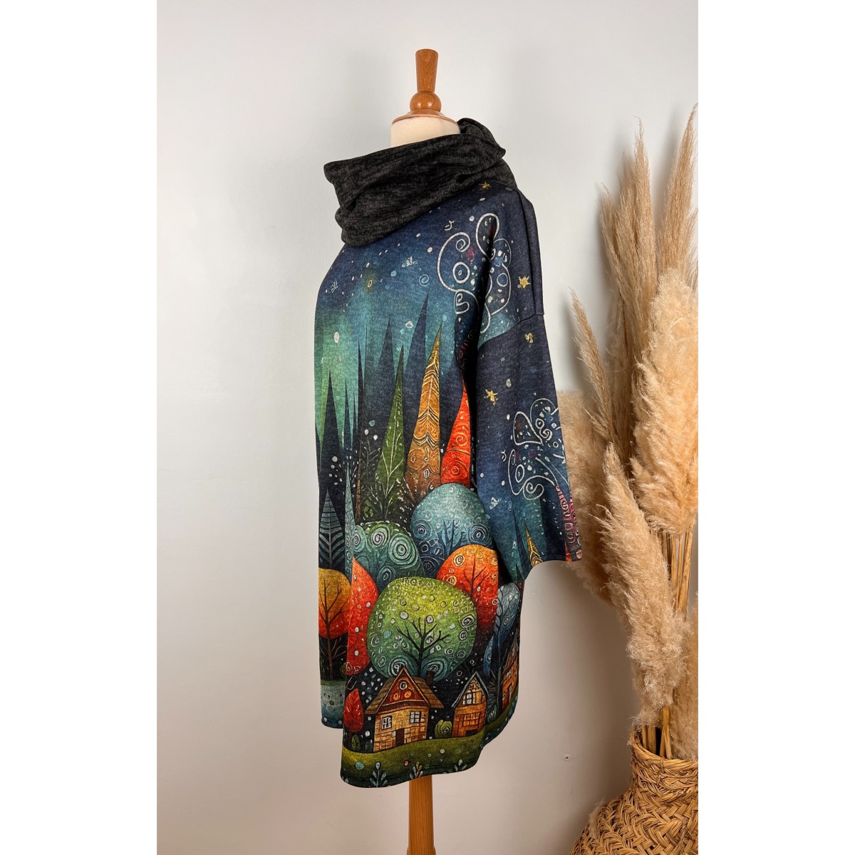 Superbe imprimé naïf pour cette robe chaude accompagnée de son écharpe tour de cou à porter ensemble ou séparément. Si vous aimez l'originalité, cette robe est faite pour vous. Elle a un très beau tombé et ne colle pas au ventre.
