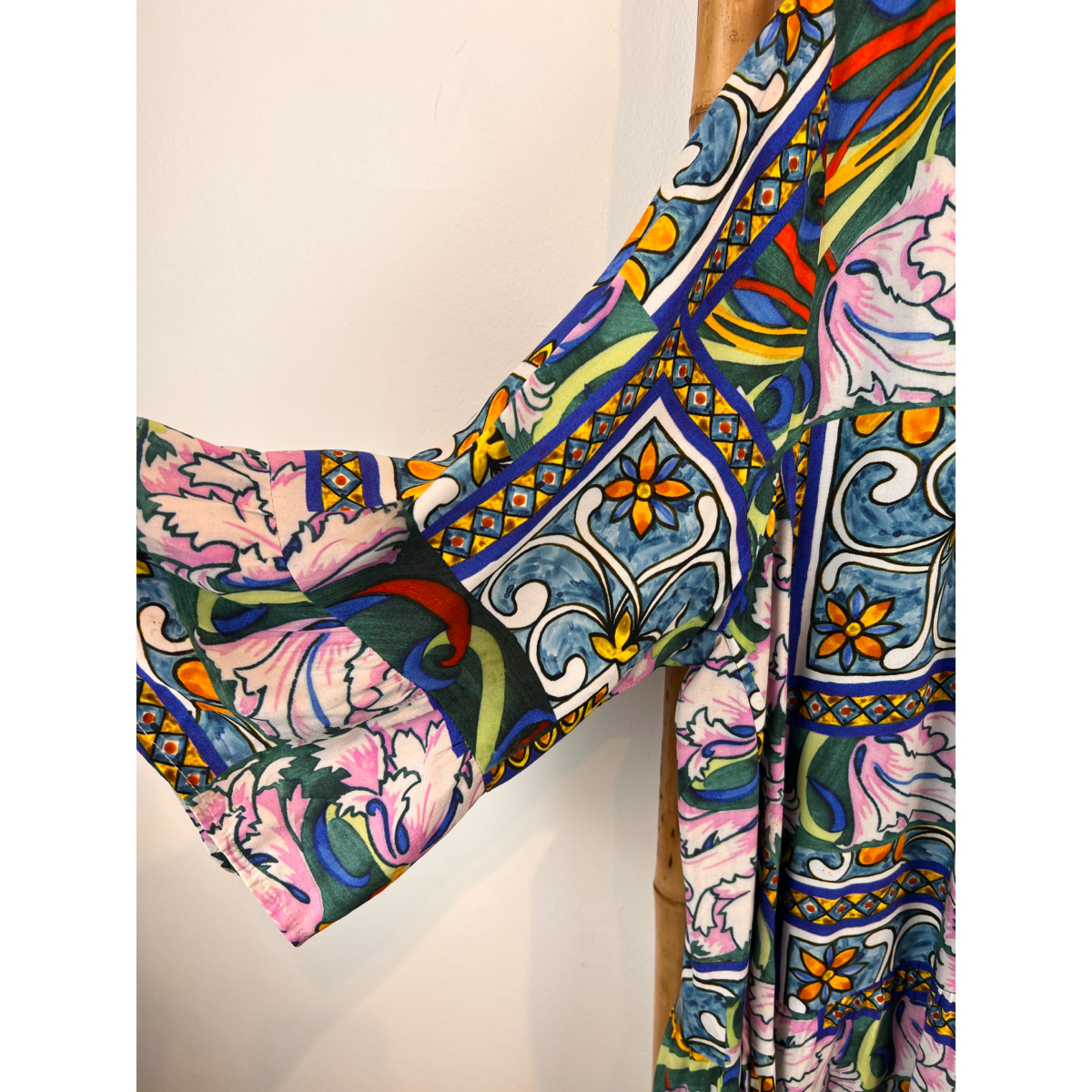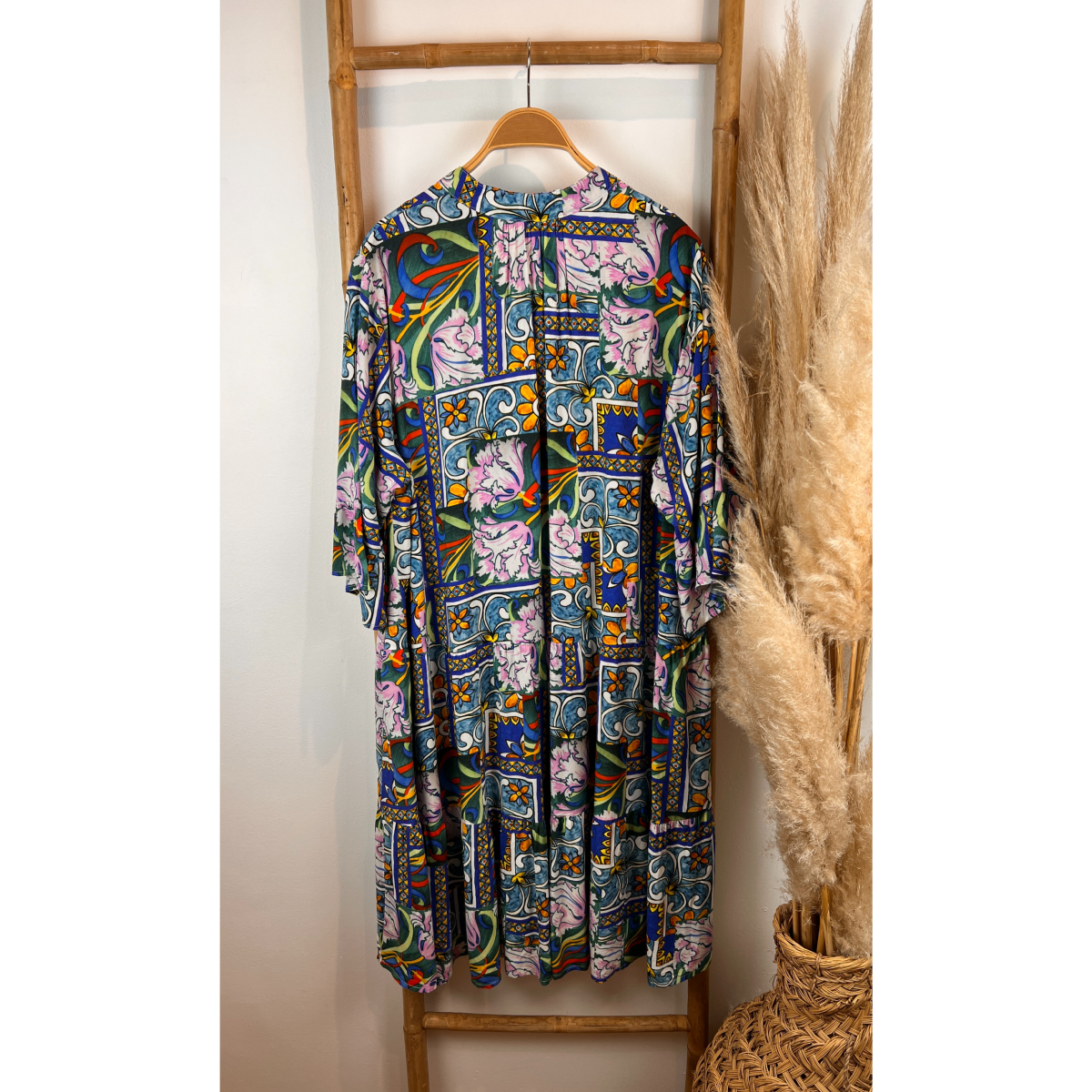 Robe fluide en viscose à l’imprimé inspiré des faïences mexicaines ou portugaises, mêlant motifs délicats et couleurs vibrantes pour un style à la fois authentique et raffiné. Sa matière légère et respirante assure un confort optimal, idéal pour les journées ensoleillées. Les volants apportent du mouvement et une touche féminine, sublimant la silhouette avec élégance.