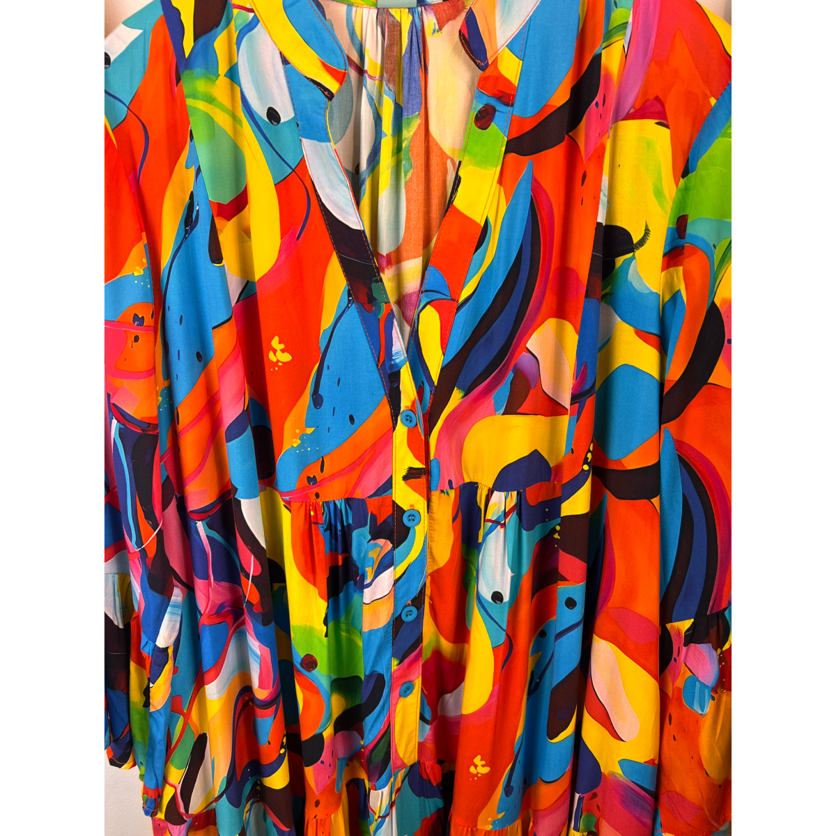 Robe longue imprimée multicolore, parfaite pour un look estival éclatant et plein de fraîcheur. Confectionnée en viscose légère, cette robe fluide et aérienne offre un tombé naturel et un confort optimal, idéal pour les journées chaudes. Son imprimé très coloré apporte une touche vibrante et lumineuse, tandis que ses volants délicats créent du mouvement et soulignent la féminité avec élégance.