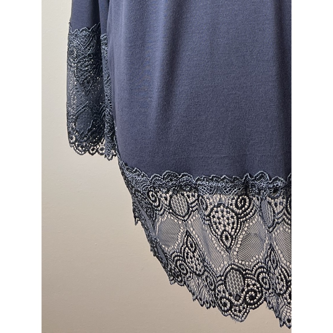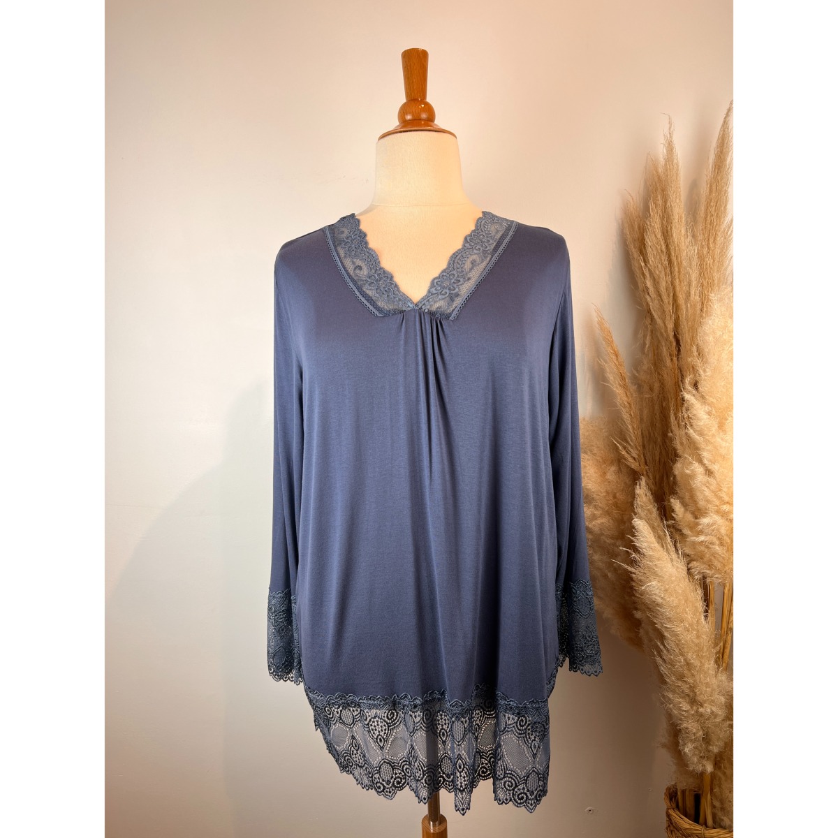Sa matière extensible et fluide s’adapte parfaitement, tandis que la dentelle délicate à l’encolure, aux manches et au bas ajoute une note féminine et raffinée. Disponible en différents coloris, il se porte aussi bien comme haut sous une veste ou sous un pull où la dentelle dépassera pour un effet superposition.