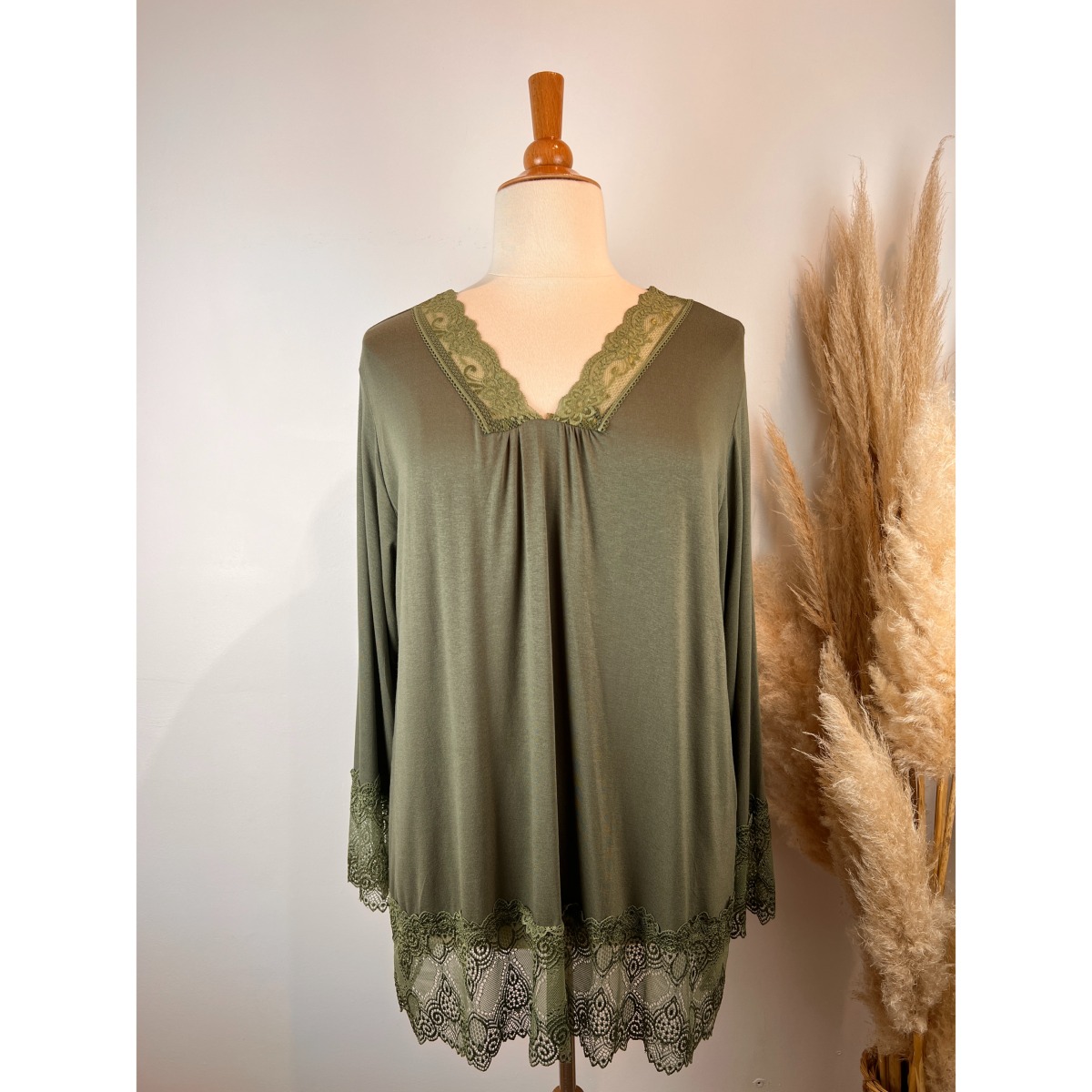 Sa matière extensible et fluide s’adapte parfaitement, tandis que la dentelle délicate à l’encolure, aux manches et au bas ajoute une note féminine et raffinée. Disponible en différents coloris, il se porte aussi bien comme haut sous une veste ou sous un pull où la dentelle dépassera pour un effet superposition.