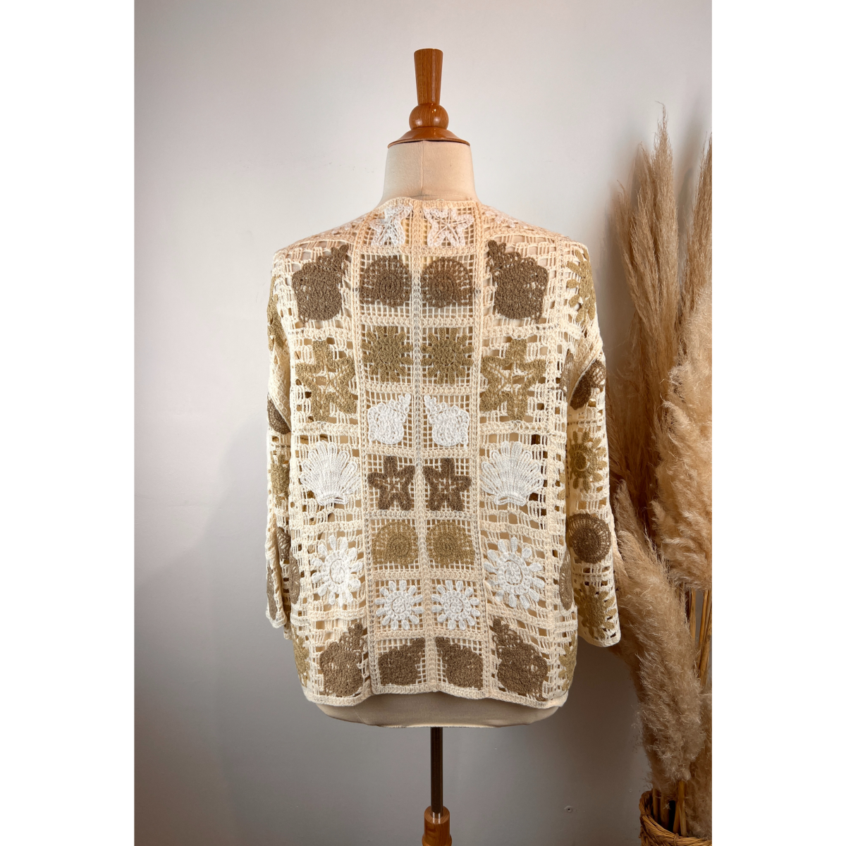 Découvrez cette veste boléro en crochet 100 % coton, la pièce idéale pour habiller délicatement les bras pendant la belle saison. Légère et respirante, elle apporte une touche bohème et élégante à toutes vos tenues estivales. Son travail en crochet met en valeur un joli mélange de tons doux de beige, blanc et marron, facile à associer avec une robe, un top ou une tenue plus habillée. Confortable et tendance, ce boléro en coton est parfait pour compléter vos looks de printemps et d’été avec style et légèreté.